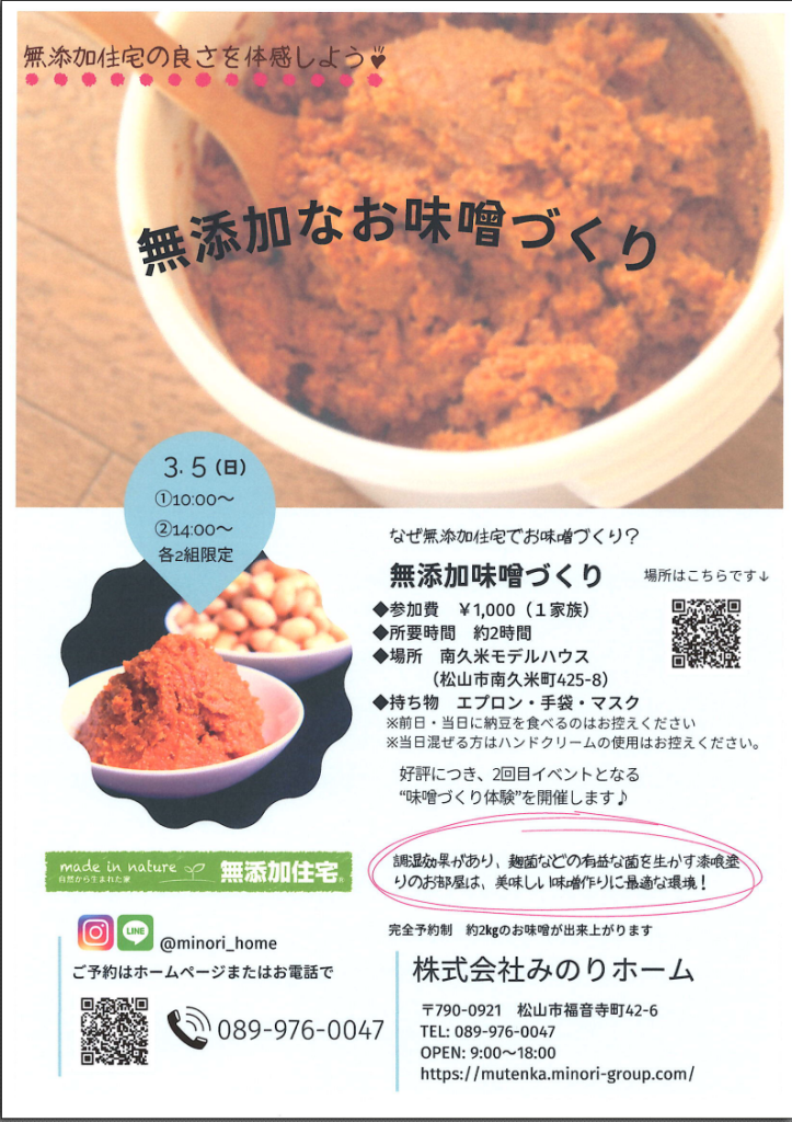 みのりホームの南久米モデルハウスで手作りの無添加味噌づくりをご体験いただけます。